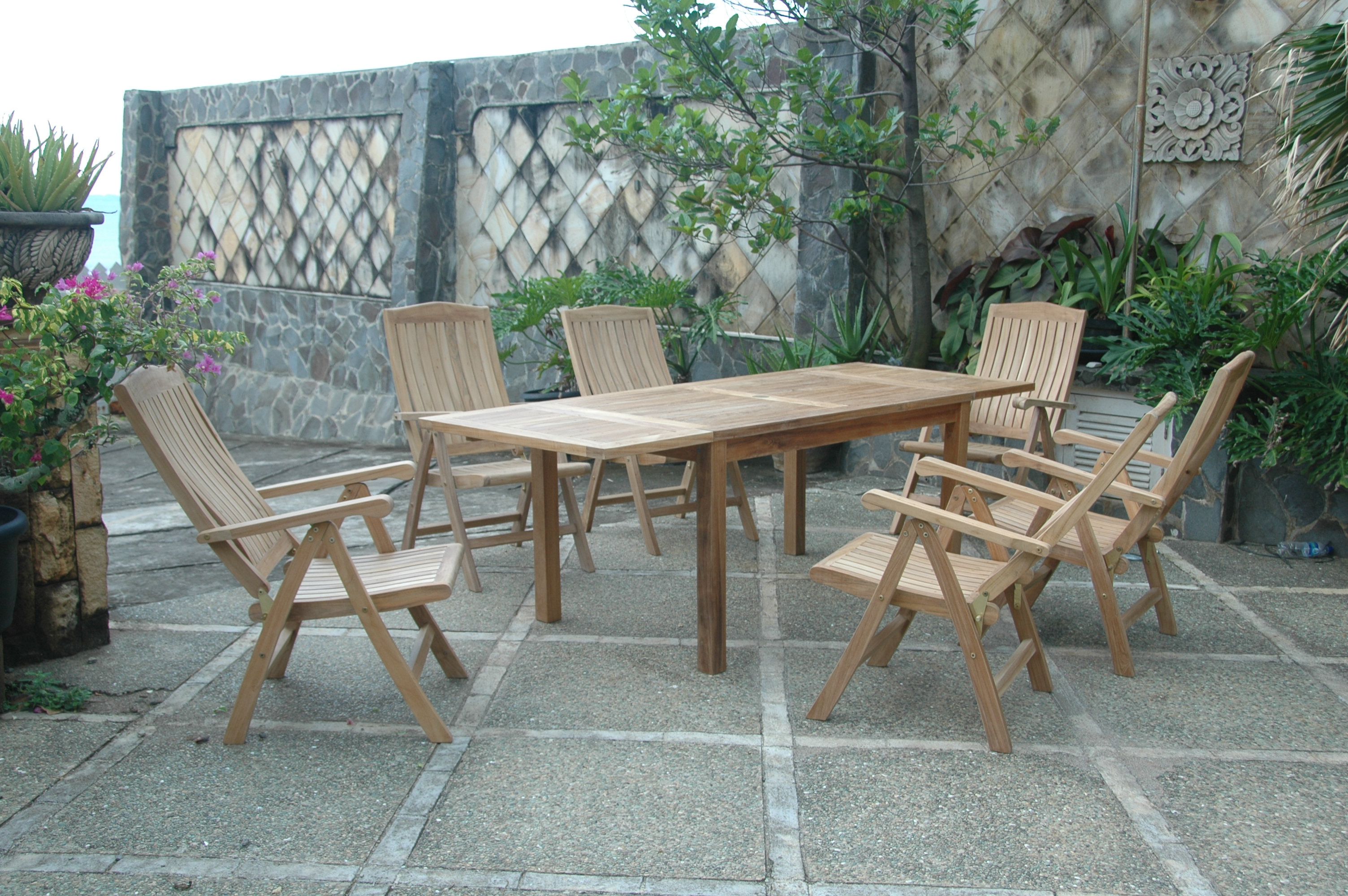 When comfort is your priority, the Katana Recliner Armchairs are the ideal choice. Five positions allow these chairs to be adjusted to your ideal comfort level; two positions for dining, and the other three for reclining, either for conversation or even for a nap. Situate this set by your pool, under a shady tree, or anywhere that relaxation is key. Included in this dining set are six gorgeous Katana recliners and our 95" rectangular extension dining table.