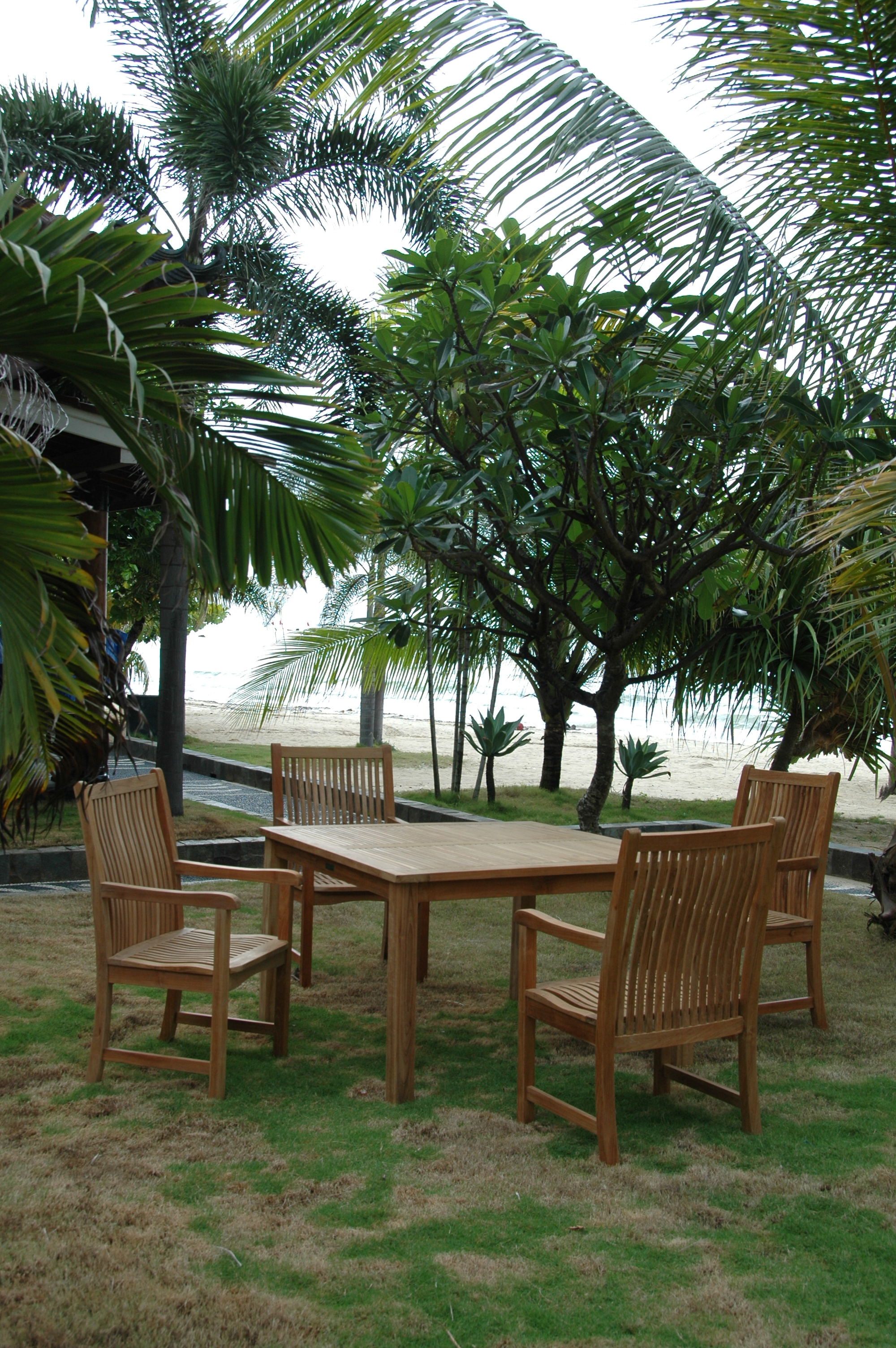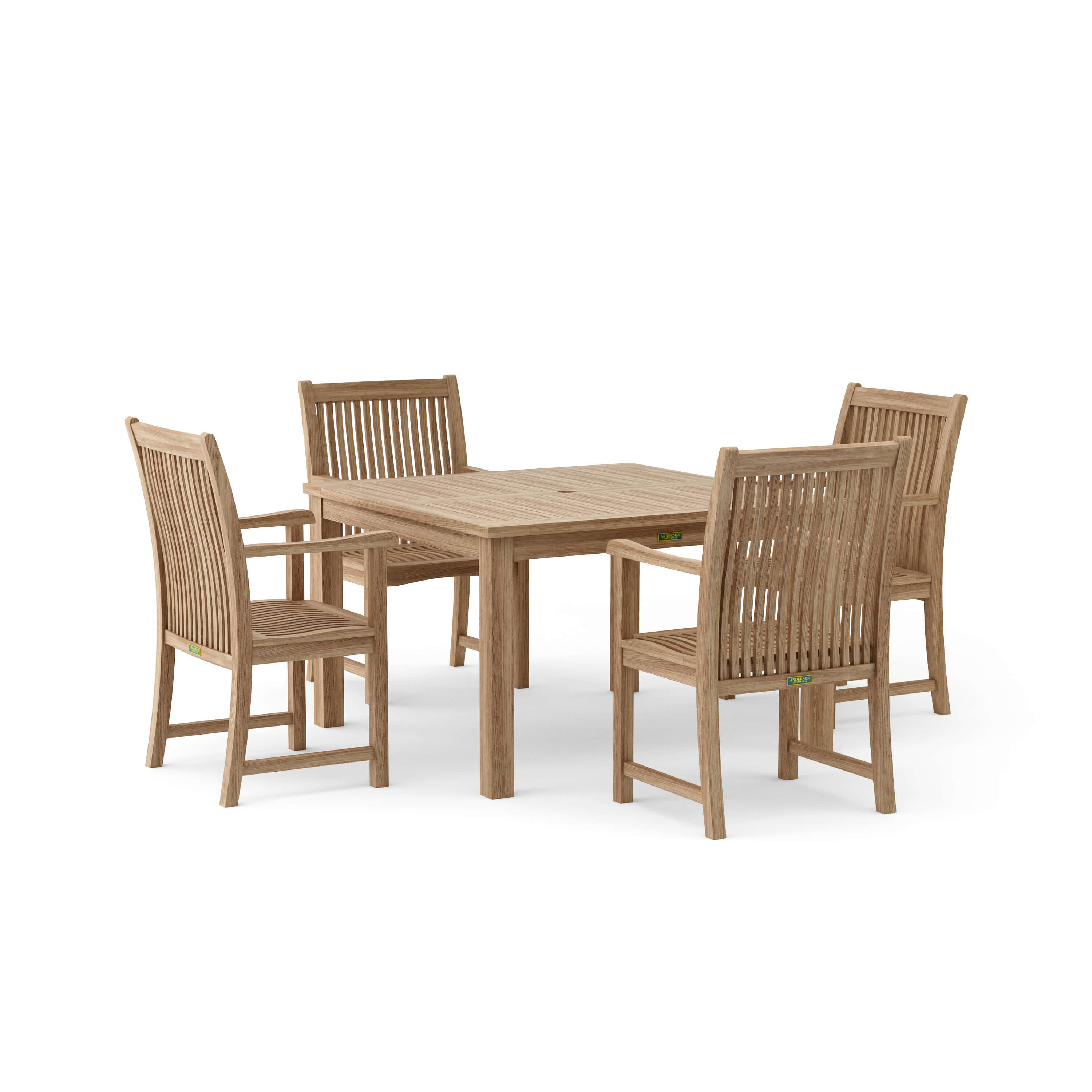 A spacious and durable teak outdoor dining set for the patio or yard, this set includes a Windsor 47” Square Table and four Chicago Dining Armchairs. Made of solid teak wood, the Windsor 47” Square Dining Table is a bulky and quality sized table that’s durable and stable; while the Chicago Dining Armchair is designed with teak slats that contour and curve on the back and seat for a comfortable sitting experience. The perfect table set for outdoor dining or a game of cards, guests will be amazed by its quality built frame and size as well as the smoothness and touch of the authentic teak wood. Table includes an umbrella hole with brass plug when not in use.