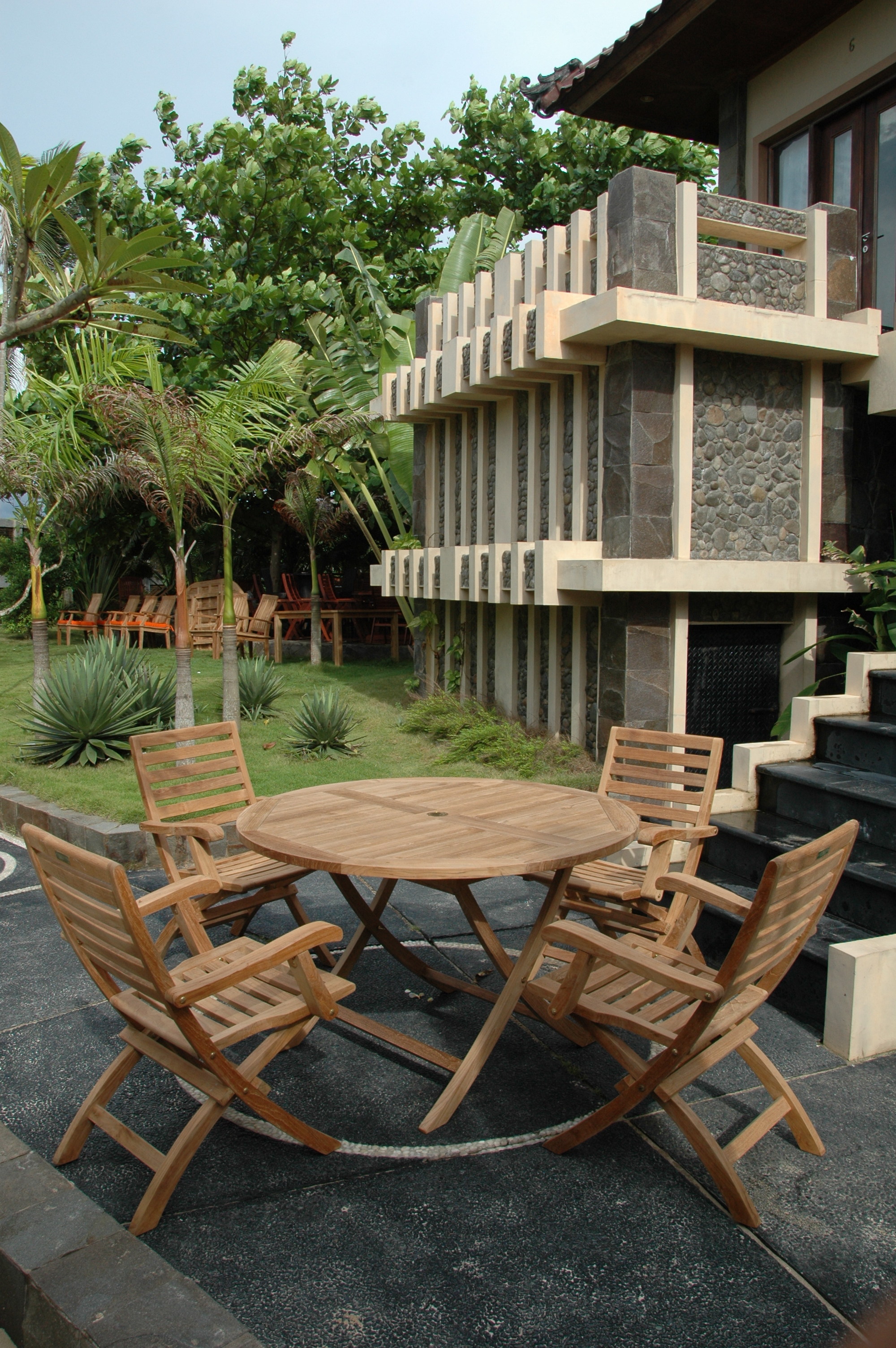 A versatile dining set for the outdoors, the Bahama 47" Round Folding Table with four Andrew Folding Armchairs is a convenient and easily accessible dining set for storage and movement when not in use. Simply fold and unfold the set in seconds; the perfect furniture set for boating, restaurant, and café where space is limited or where chairs are only required occasionally. Made of premium grade unfinished teak, this set is sanded smooth for a natural smooth touch.