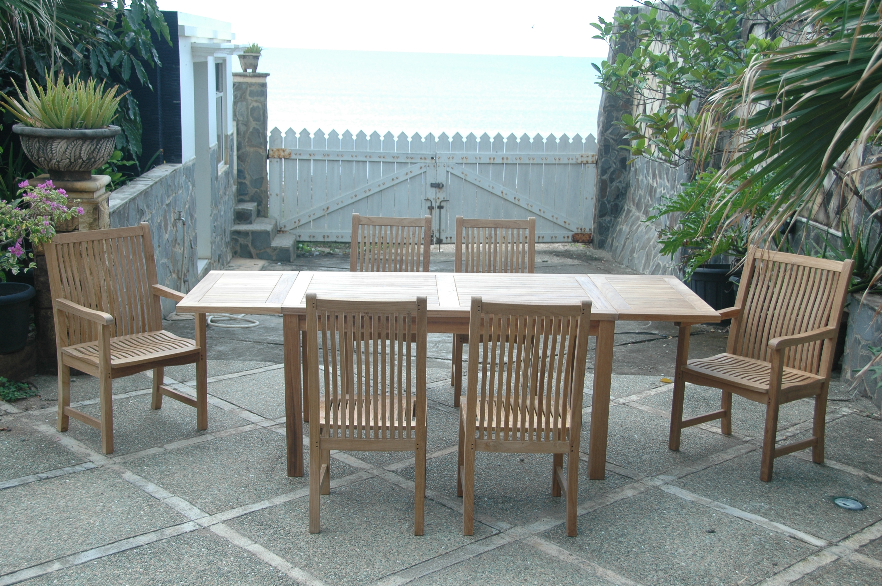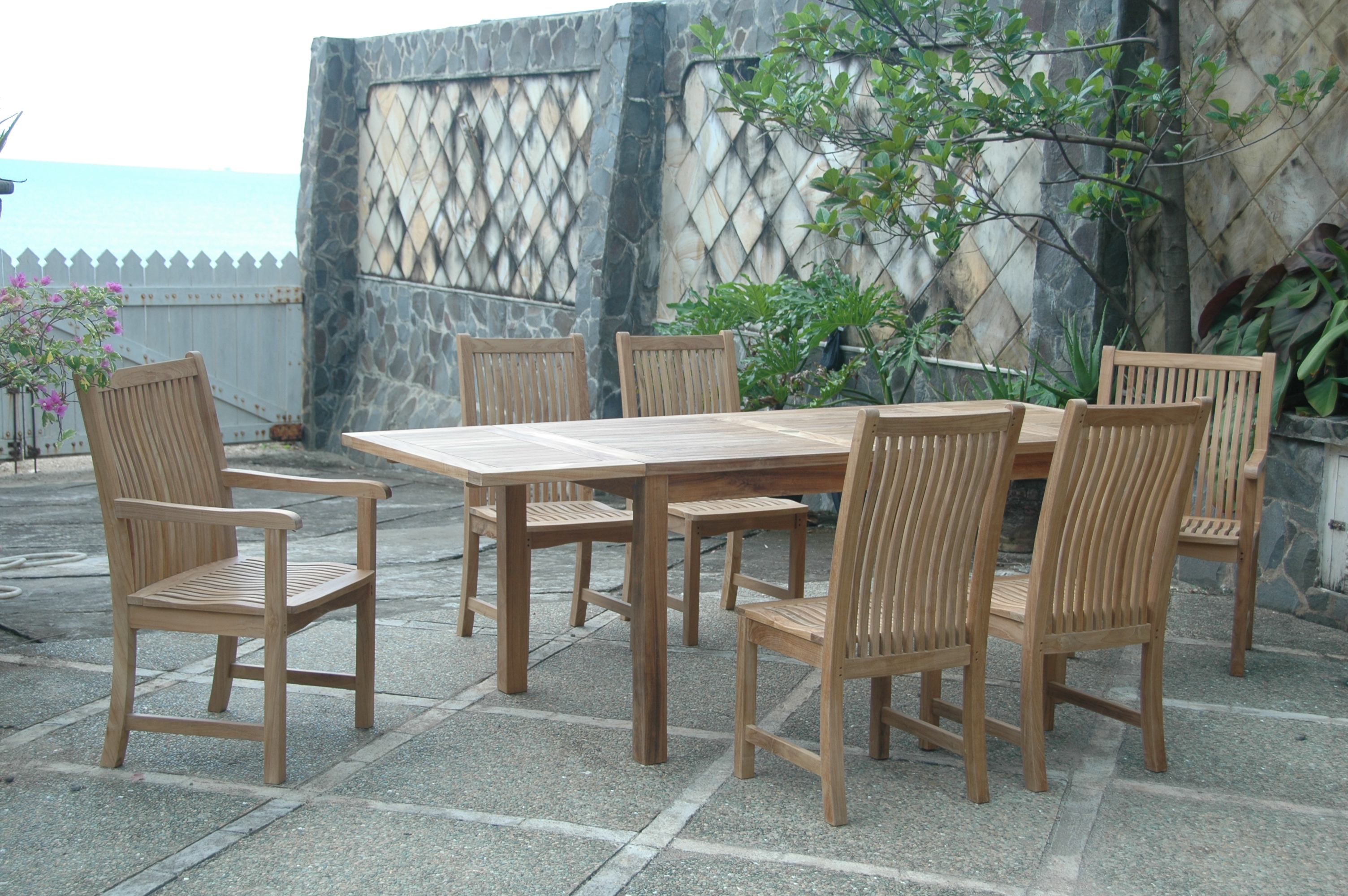 Enjoy the comforts of outdoor dining with this premium teak Dining Set. Featuring the Bahama 95" Rectangular Extension Table with four Chicago Dining Chairs and two Chicago Dining Armchairs, its the perfect dining set for the home and outdoors. The Bahama 95" Rectangular Extension Table features a unique built-in butterfly pop-up leaf that enables you to open and close your table in 15 seconds, with a length of 59" closed and 95" fully extended. Also includes four Chicago Dining Chairs and two Chicago Dining Armchair with curved back and armrest support for a comfortable dining experience. Made from premium grade teak unfinished and sanded smooth, the perfect material for weathering the outdoors.