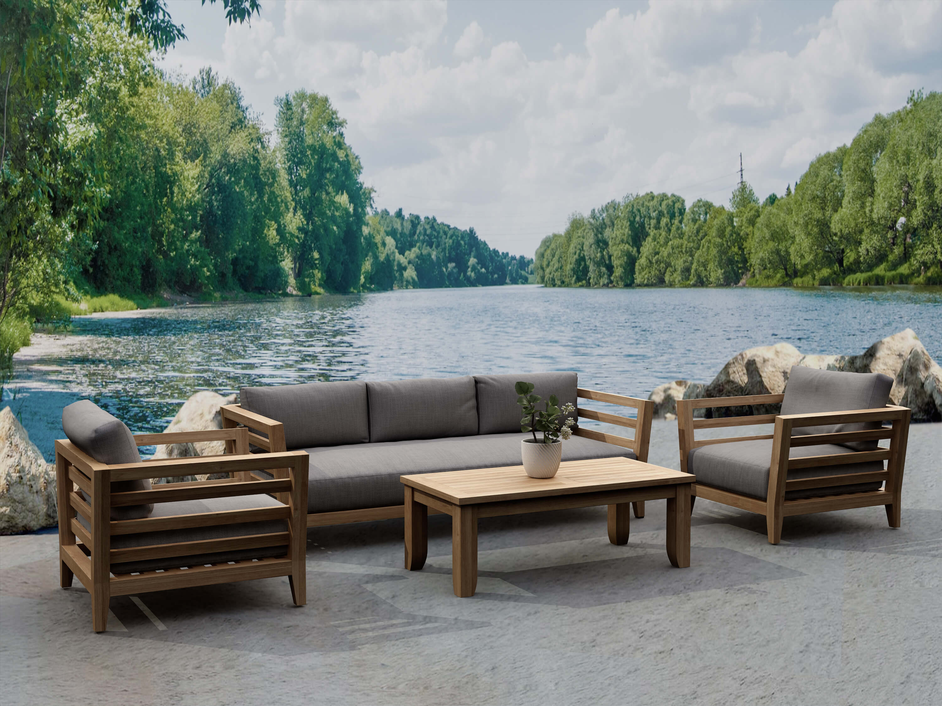 A modern classical design from the best grade of natural unfinished teak, enjoy a relaxing outdoor deep seating experience with the Cordoba 4-Piece Set. Includes two Cordoba 1-piece armchair built with quality and shaped to exquisite form, take a seat as the armchair comfortably coddles you in. Also arrives with one rectangular coffee table and one Cordoba 3-Seater bench with a length size of 86" or 7 Feet, effectively functional as a large daybed as well. Outdoor Sunbrella cushions saturated with UV-stable pigments that resist color fade, water, mold, and mildew come included with cushion options and colors available.