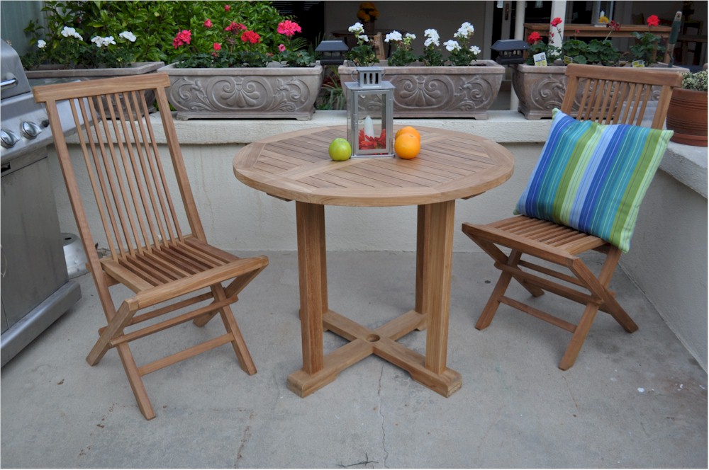 A very gorgeous dining set that will shine under any décor but made for outdoor living. It comes with 1 round table and 2 folding chairs. Cushion and accessories are not included. There is no umbrella hole on the tabletop. Made of solid teak wood coated in a waterbased seal for added weather protection.