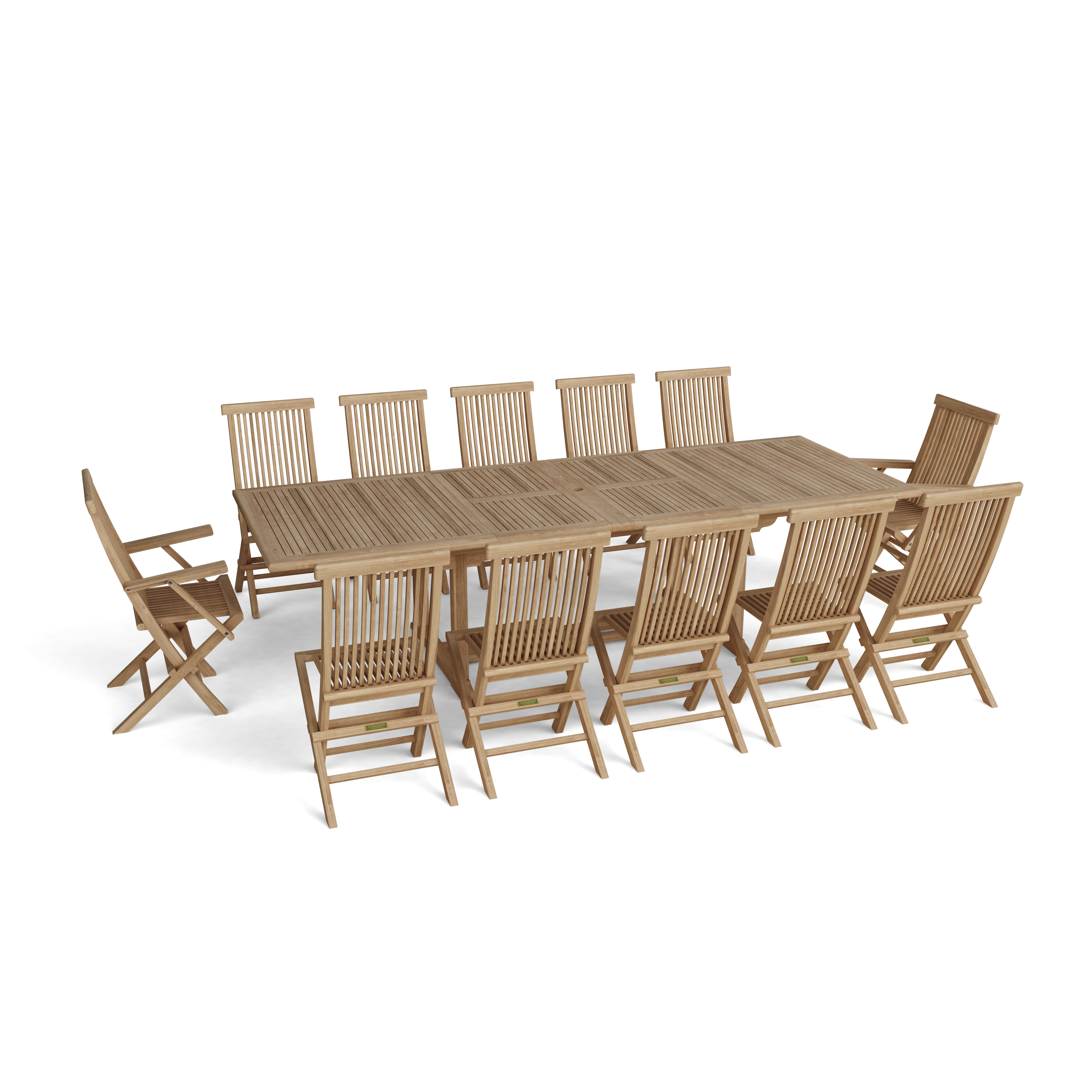 If you'd like to comfortably seat ten to twelve people outdoors, then this is the table for you. Our Valencia 117" Rectangular Double Extension Table, which comfortably seats eight at 79" Length can be transformed into a 117", 10 - 12 seater or even 14 seater. Simply separate the table top until the extension leaf is revealed, then rotate and unfold the leaf into position. Also includes 10 Classic Folding Chairs and two Classic Folding Armchairs, a convenient and fast way to save space and storage. All pieces made from state managed & re-harvested authentic Indonesian Premium Grade-A Teak unfinished and sanded smooth.
