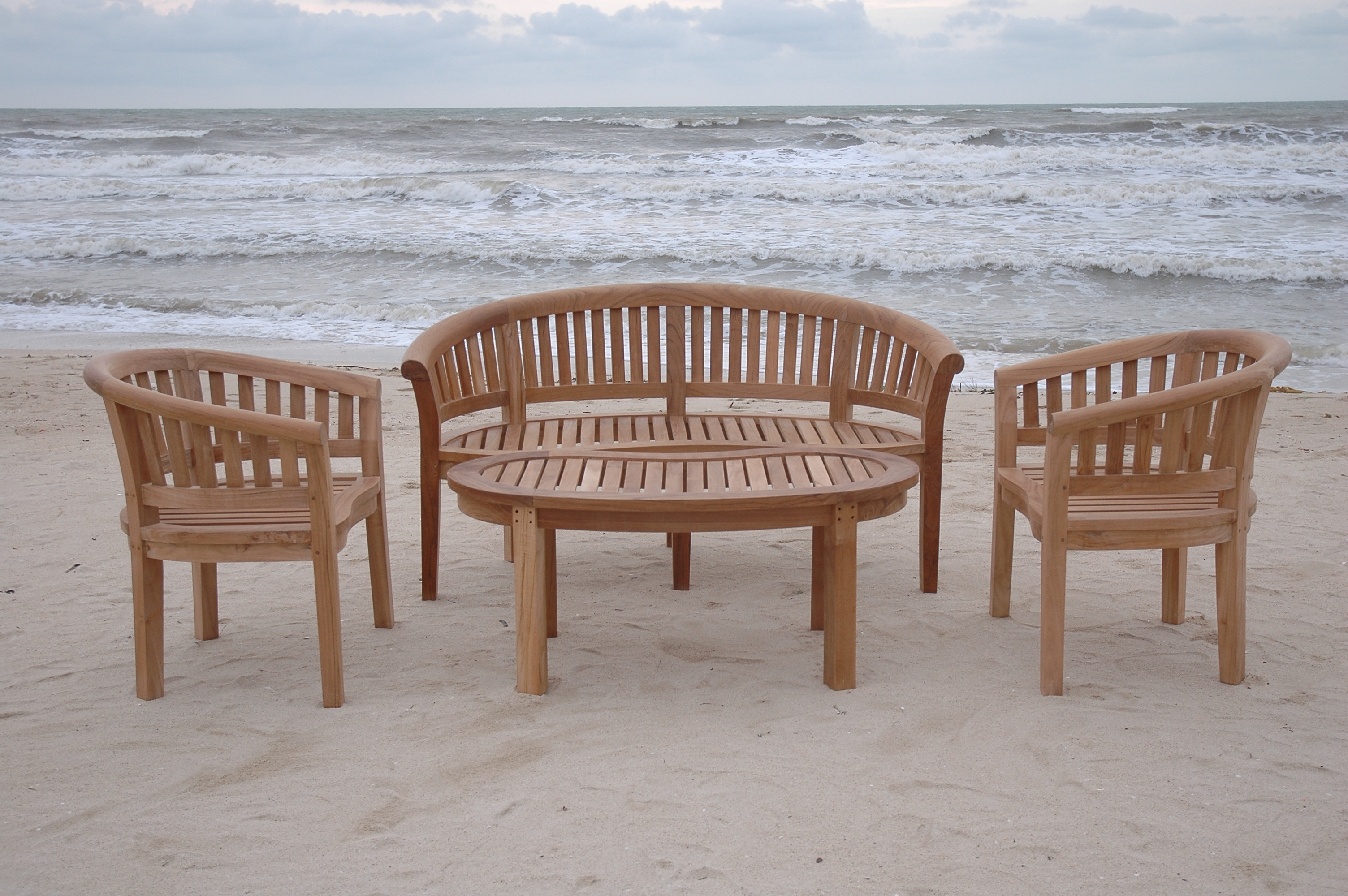 An outdoor conversation set for the yard and garden, it features a thick and quality built frame thats expertly crafted with quality featuring a beautiful "curve bench styling" that is artistic and unique. We have made subtle but careful design changes to ensure excellent back support and contoured seats for extra comfort. Place a single bench under your trees; or use a group of benches and chairs for entertaining. Set arrives with two Curve Extra Thick Dining Armchair, One Curve 3-Seater Extra Thick Bench, and a curve coffee table. Add All-Weather Sunbrella cushions to create more color accent and comfort for this set. All pieces made of premium grade unfinished teak. Quality built for generations.