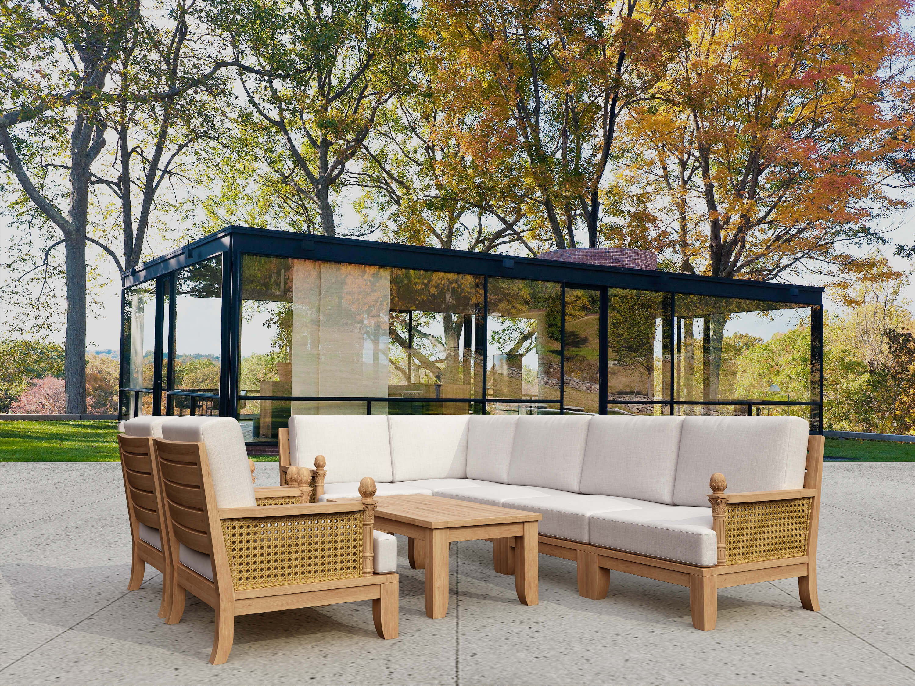 This Luxe Deep Seating Set exhibits classic elegance with intricate details providing deep seating comfort in the luxury of the outdoors. Made of Synthetic Rattan, the sides of the armchair are intricately designed culminating with pineapple floral motifs that’s handcrafted from our expert craftsman of teak wood. The set includes two Luxe Armchairs with one right, left, corner, and two center modular pieces to create a sectional sofa that sits up to four. Also includes the 48″ Luxe Rectangular Coffee Table. Built from genuine Grade-A Teak wood sanded smooth without finish, it includes 6″ All-Weather Sunbrella Fabrics and Cushions with your color choice and pattern making the perfect set for the outdoors.