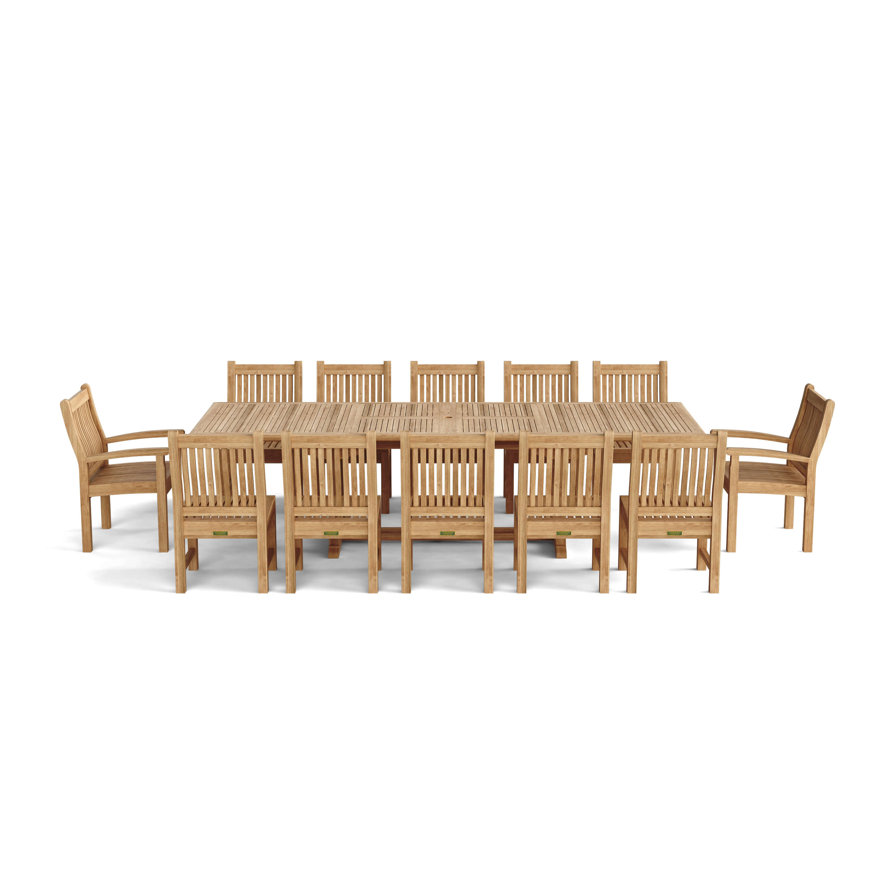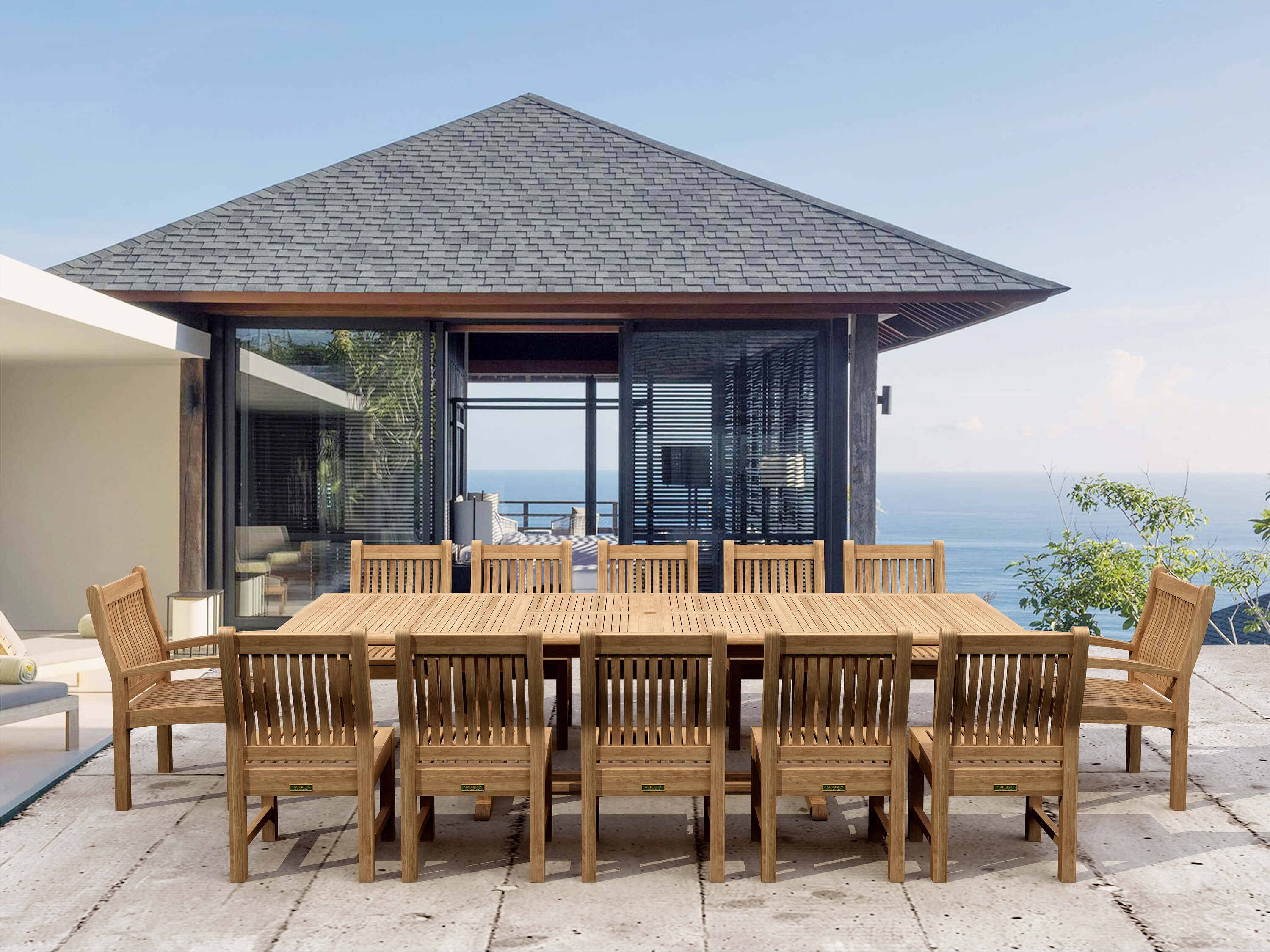 The Valencia Oval Double Extension Table makes the perfect addition to your patio or backyard. The unique built-in butterfly pop-up leaf enables you to open and close your table in less than 15 seconds. The leaf folds under for easy storage. This table stands 29″ high and is 43″ wide by 79″ long and if fully extended can reach to 117″ long. The table can be extended with 1 or 2 leaves, seating 10 to 12 people comfortably. Available with 2" umbrella hole with brass plug when not in use. This table arrives with 2 Sahara Dining Armchairs and 10 Dining Chairs with contoured seats and traditional curved back adding comfort and support. The style will never go out, but quietly blends with any decor. Built with extra thick Grade-A teak, it arrives sanded smooth without finish in its natural form and color. Guaranteed to last for generations.