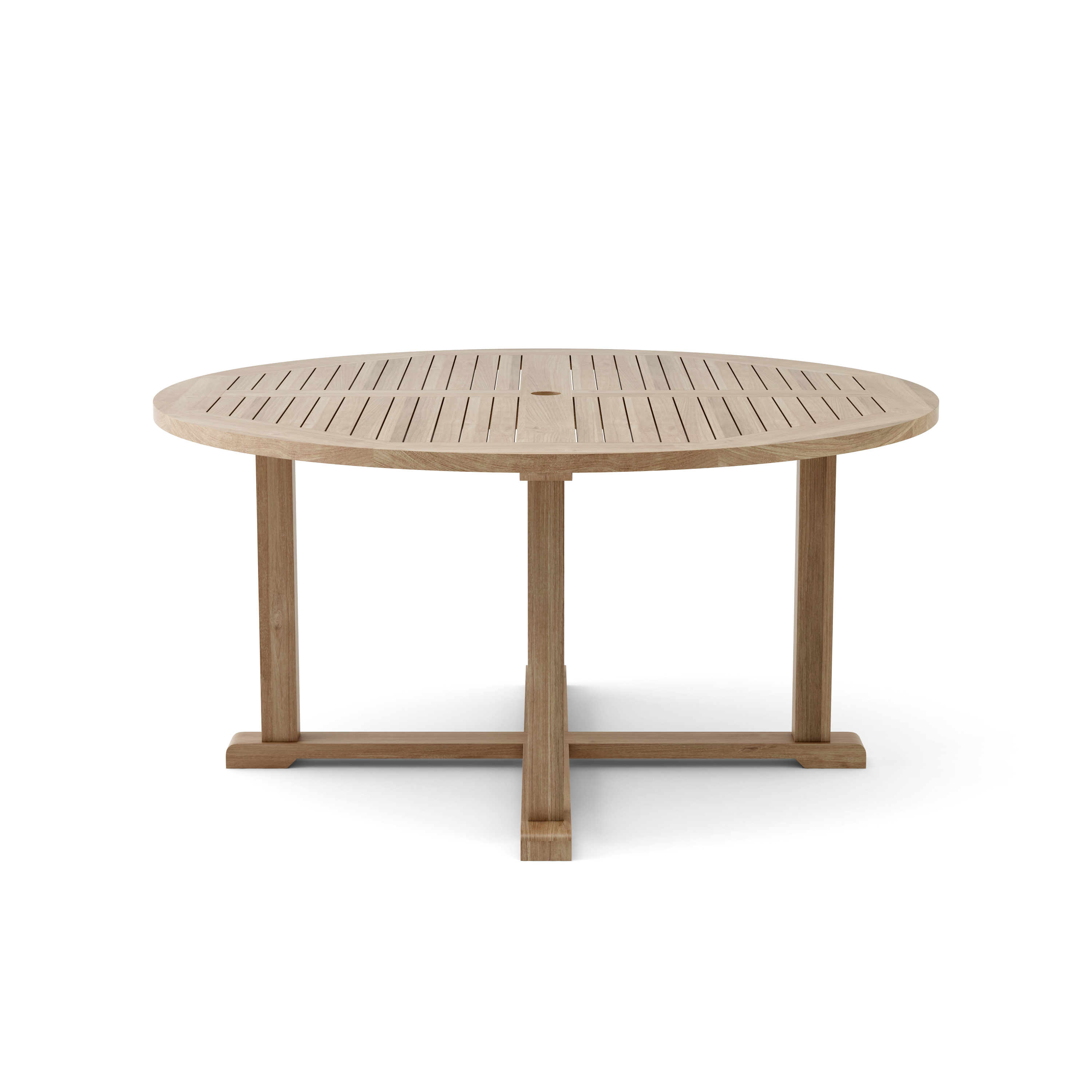 This Tosca 59” Round Table is a sturdy and spacious outdoor teak table perfect for your patio, garden, or yard. This table stands at 29″ high and is 59”round, seating up to 5-6 people comfortably. Made from genuine teak wood sanded smooth, it is smooth to the touch and is the perfect material for the weathering of rain, hail, or shine. Includes umbrella hole in center and brass plug.