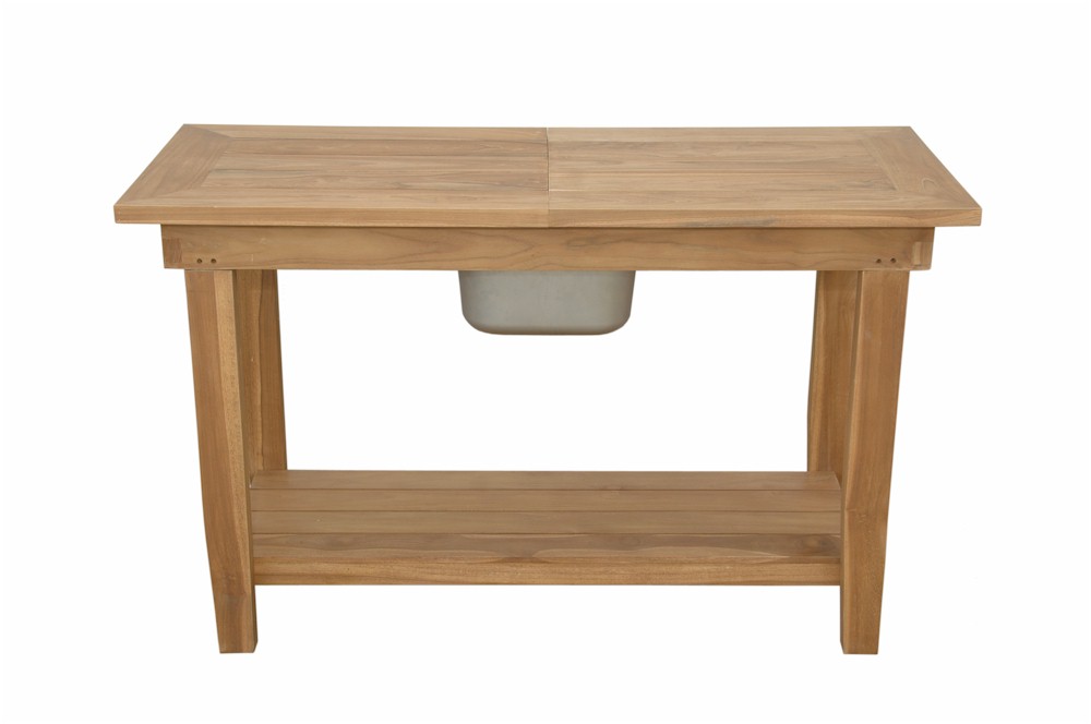The Nautilus Console Table is a uniquely designed table perfect for storing cold drinks in your home or patio. Made of plantation kiln dried solid teak wood with wide-slats using mortise-tenon joinery, this table features a stainless steel container and large shelf for storing ice cubes and your favorite cold drink. Perfect for entertaining your family and friends at your backyard, open by pulling the table top and use the stainless steel container for putting ice cube with bottles and cans or close it when not in use for a convenient console table. The table comes knock down and easy to assemble. Made of solid teak wood treated in a waterbased sealer for added weather protection.