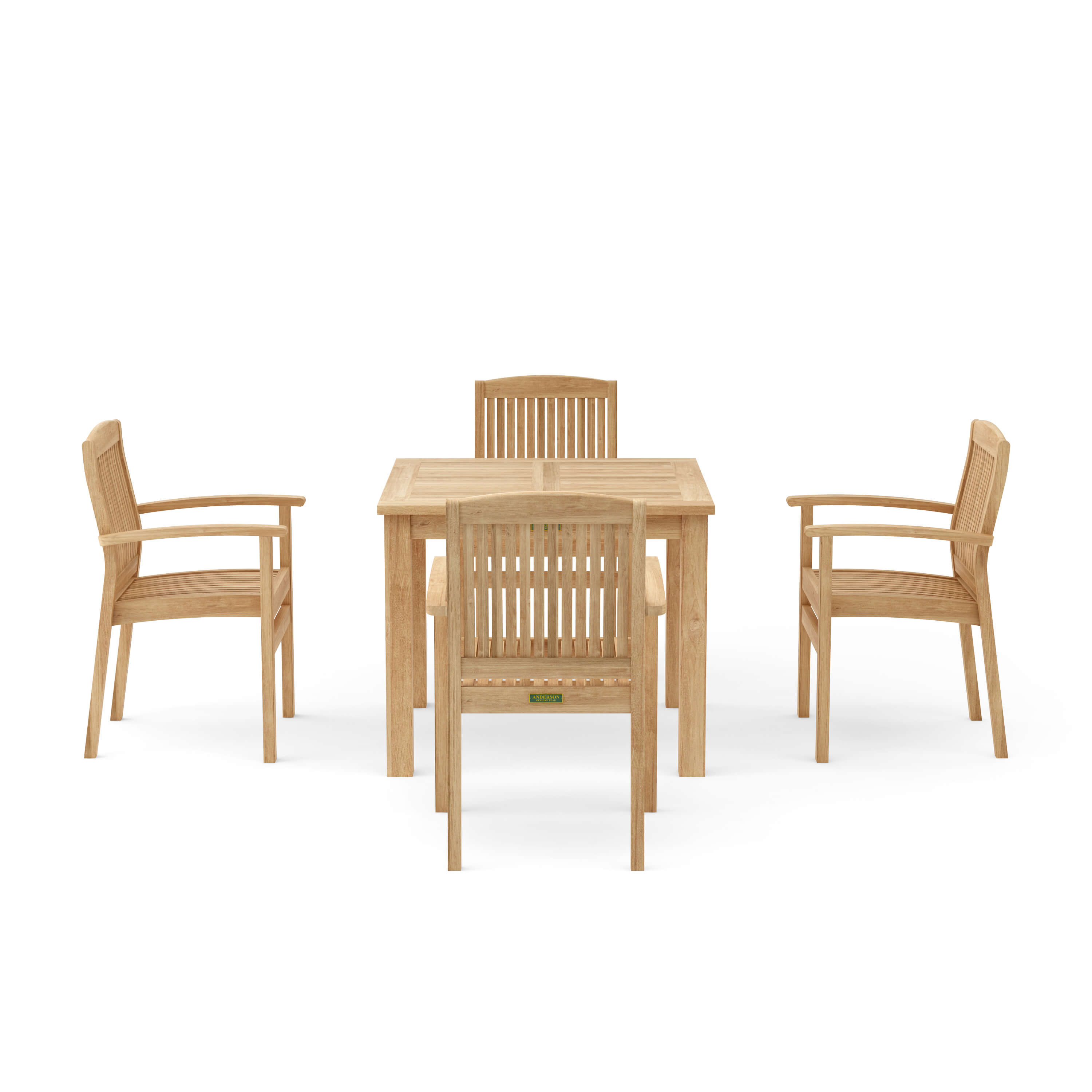 Enjoy the beauty of your backyard and the pleasure of outdoor dining with the Bahama Dining Table and Sahara Stacking Armchairs. This set includes a 35″ Bistro Square Table that fits four people comfortably with four Sahara Stacking Armchairs featuring contoured back and seating for added comfort. Table is constructed using mortise and tenon joinery for strength and durability while the stacking chairs arrive fully assembled. Made of premium grade unfinished teak this set will provide decades of dining enjoyment with family and friends.